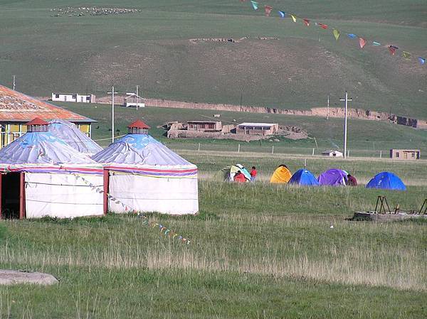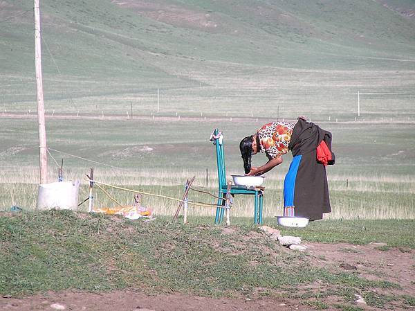 雖然司機老大抽著菸擺明不在往前,我還是抓緊時間展開草原初體驗。剛邁開大步,就看見遠處藏胞走出一位藏女──她先在木架上擺好水盆,接著解開腦後髮辮,自在地洗起頭來。