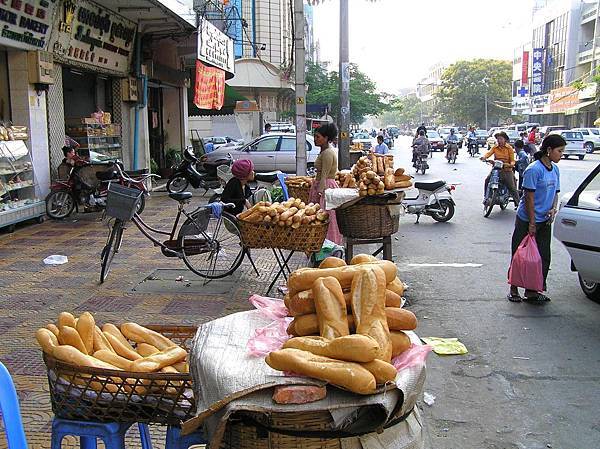 中央市場人聲鼎沸,可以感受當地的豐沛生命力,卻不是悠閒漫步的好地方。順著長廊步出市場,外面的幾條街道反倒適合邊吃邊逛。其中著名的麵包一條街,遊人絕對不會錯過,因為短短幾步路,居然有十幾個攤子都賣法國麵包。這些攤位配備十分簡陋,一輛腳踏車、幾個竹簍就當街做起生意。黃昏時刻,家庭主婦上街買麵包,可都是一大袋一大袋的提回家呢!